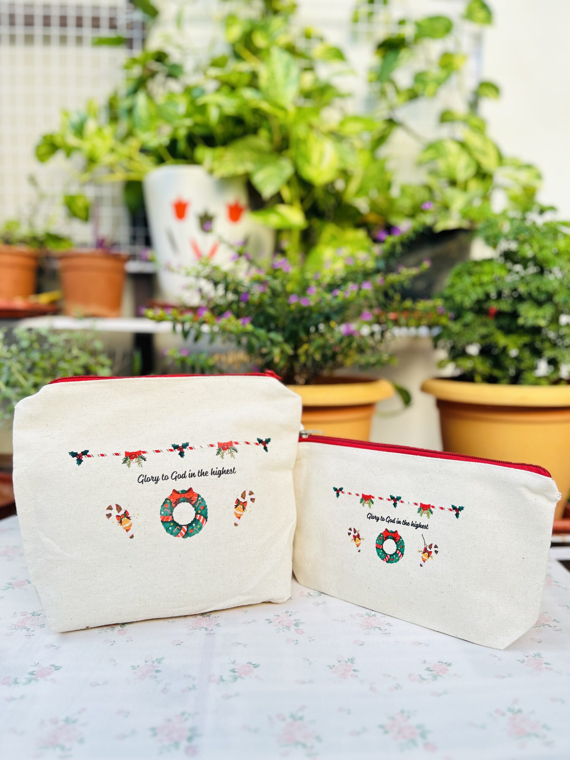 Festive combo of 1 Christmas Mini Pouch + 1 Christmas Travel Pouch, made with 400 GSM canvas, cream colour, Christ-centred Christmas print, and durable red zipper. Strong, spacious, and perfect for gifting and daily essentials.